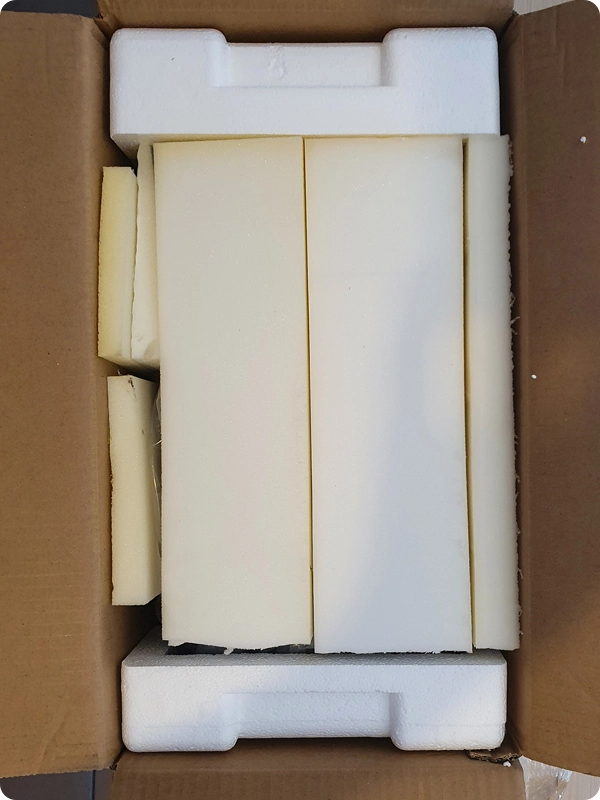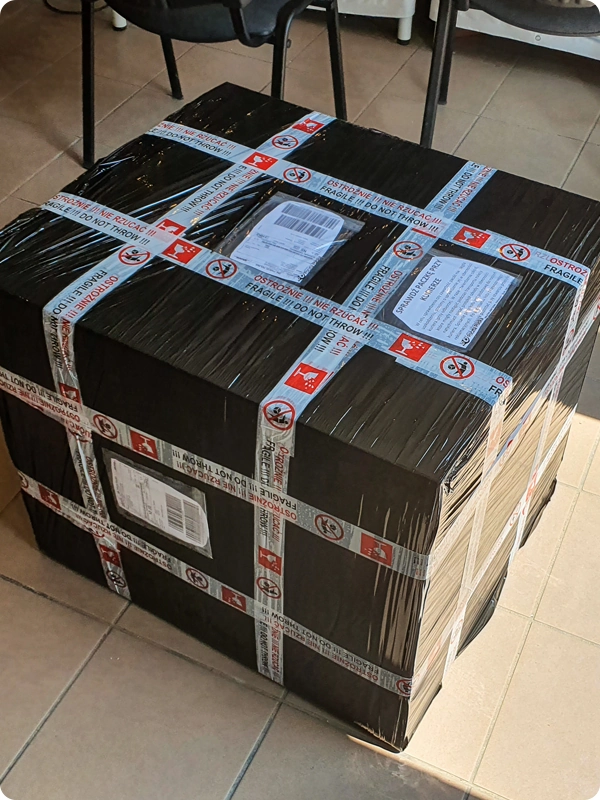 Stacja robocza umieszczana jest w dedykowanym kartonie transportowym, który oprócz fabrycznych wkładek styropianowych jest dodatkowo zabezpieczany warstwami pianki amortyzacyjnej. To dwuetapowe zabezpieczenie skutecznie chroni sprzęt przed wstrząsami i uderzeniami podczas transportu.
