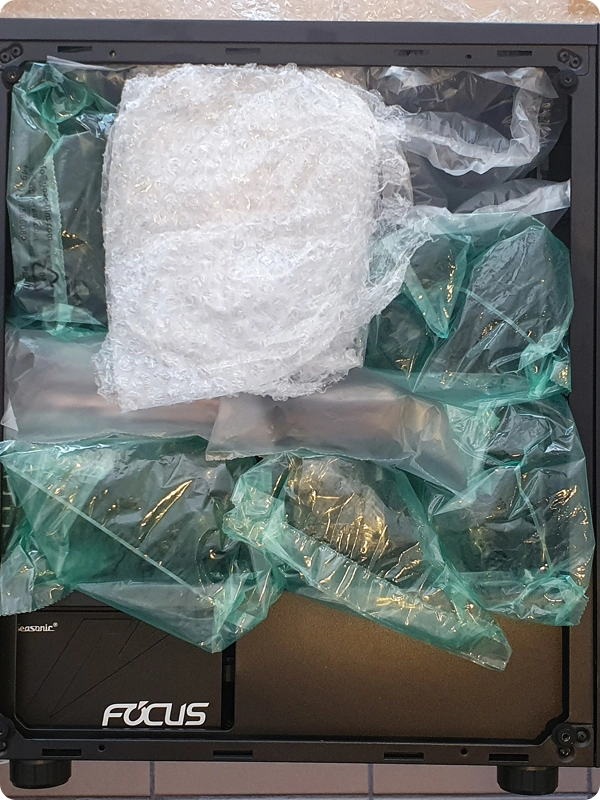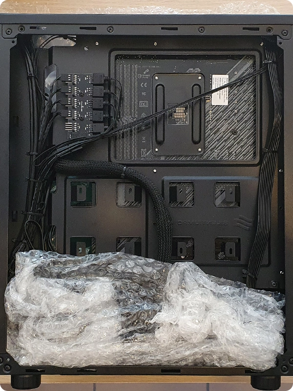 Podobnie jak w przypadku przedniej części, tutaj również wkładamy folie bąbelkową w celu dodatkowego wypełnienia przestrzeni między obudową. Ten krok zapewnia dodatkową amortyzację i stabilizację komponentów wewnątrz komputera.