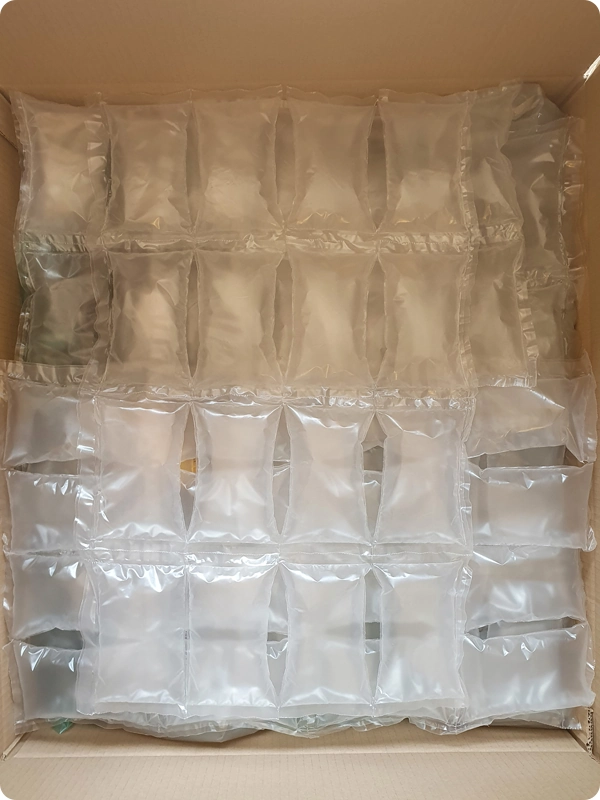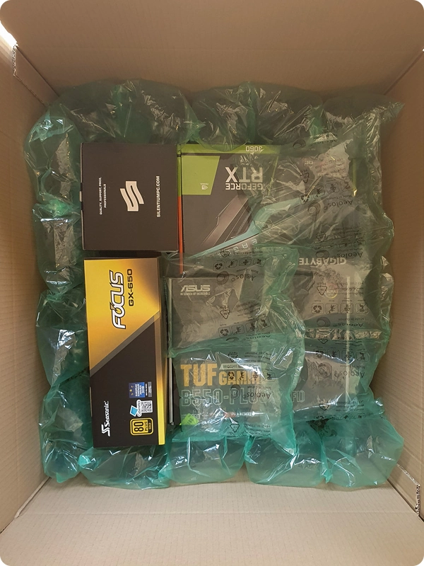 Wewnętrzna przestrzeń obudowy, w szczególności w obszarze kart rozszerzeń, jest szczelnie wypełniana poduszkami powietrznymi dostosowanymi do specyficznej konfiguracji stacji roboczej. Zabezpieczenie to minimalizuje ryzyko poluzowania się komponentów podczas transportu.